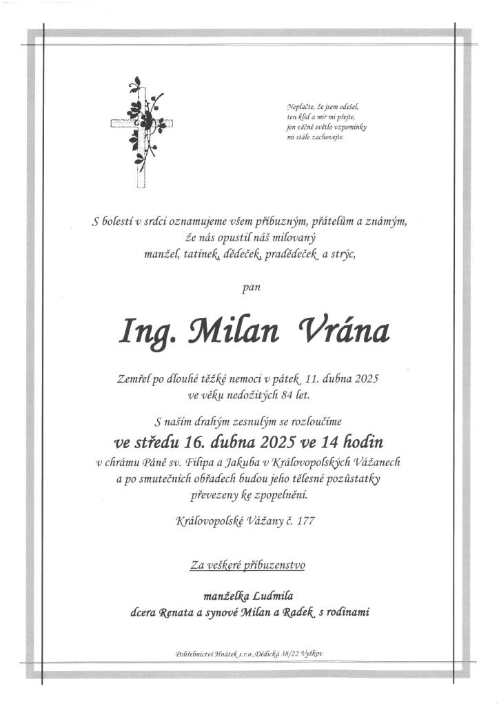 Opustili nás - Ing. Milan Vrána