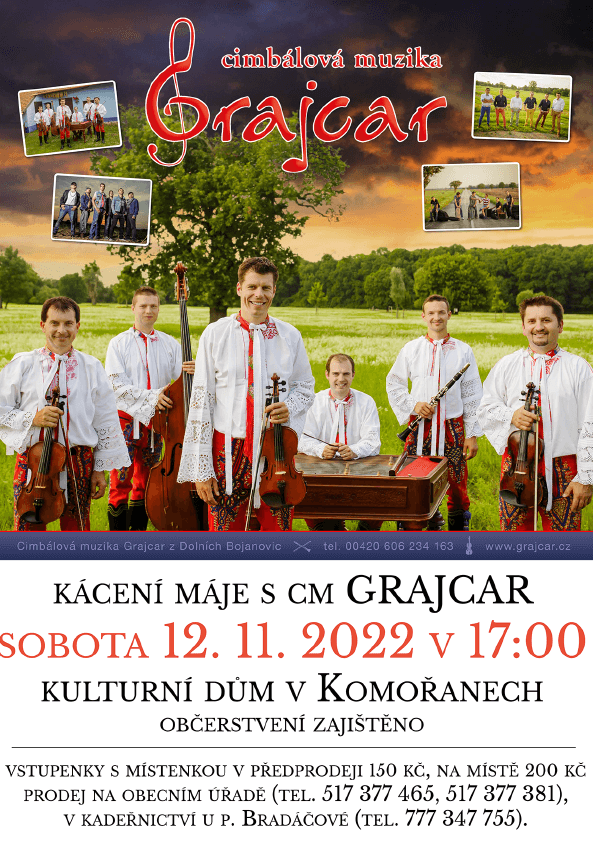 Vstupenky s místenkou lze zakoupit na Obecním úřadě v Komořanech (tel: 517 377 465 nebo 517 377 381) nebo v kadeřnictví u p. Bradáčové (tel: 777 347 755).
