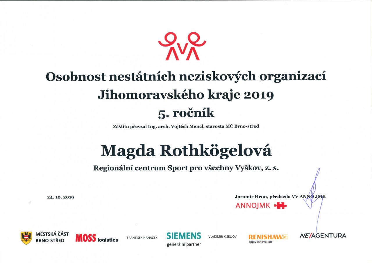Osobností nestátních neziskových organizací Jihomoravského kraje pro rok 2019 je paní Magda Rothkögelová z Rousínova!